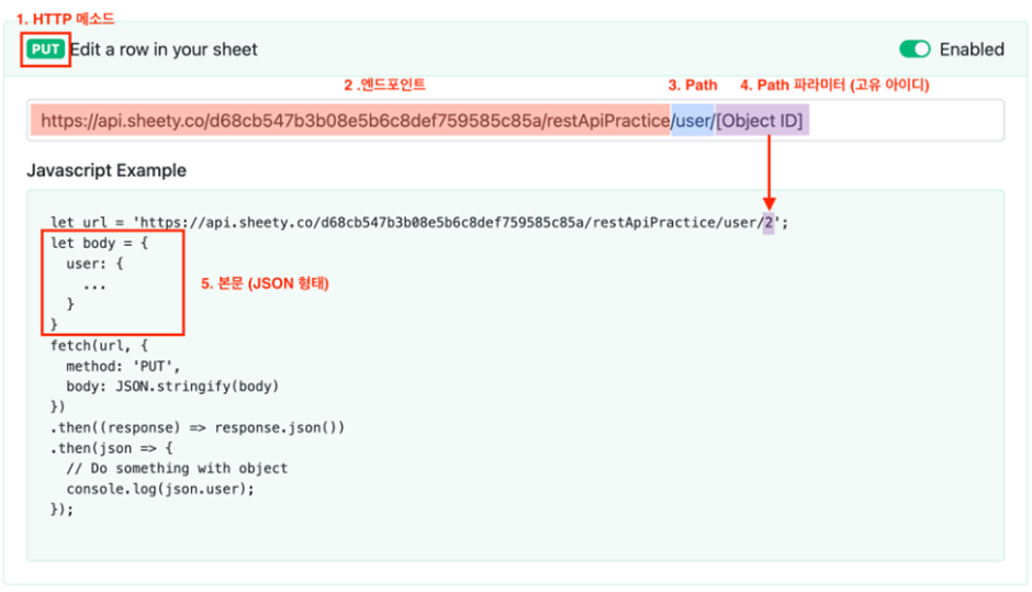 객체 ID는 변수입니다. 특정 행(row)을 수정하려는 것이 이 API의 목적이므로, 해당 행을 선택해서 URI에 넘겨주어야 합니다. 각 고유의 행은 객체 ID를 가지고 있습니다. (GET 요청으로 확인할 수 있습니다) 이 객체 ID로 특정 행을 선택해 해당 행의 내용을 수정할 수 있습니다.