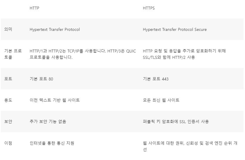 - 보안 : HTTP 메시지는 일반 텍스트이므로, 권한이 없는 당사자가 인터넷을 통해 쉽게 액세스 하고 읽을 수 있습니다. 반면, HTTPS는 모든 데이터를 암호화된 형태로 전송하여 제3자가 네트워크를 통해 데이터를 가로챌 수 없습니다.