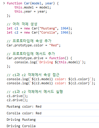 - drive()라는 메서드를 프로토타입에 추가하면 Car로 생성된 모든 객체에서 이 메서드에 접근할 수 있습니다.