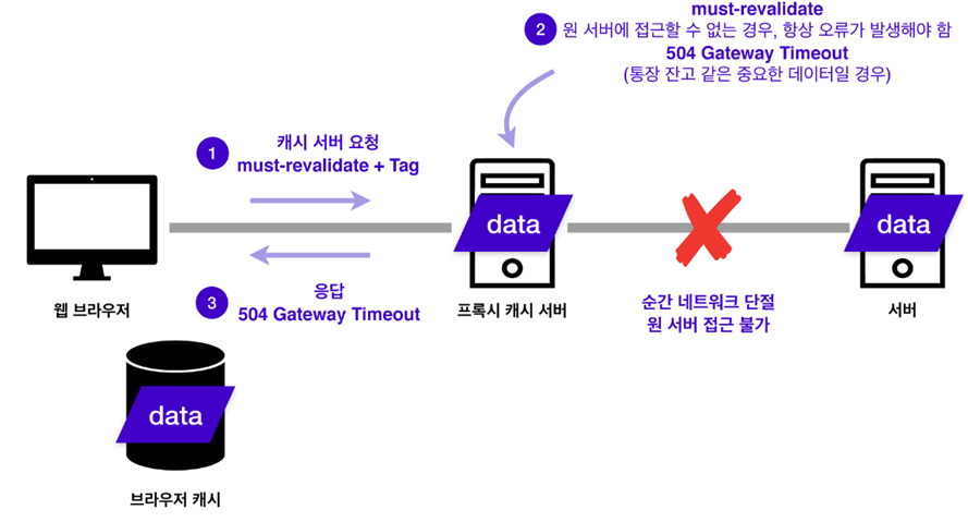 must-revalidate라면 원 서버에 접근이 불가할 때 504 Gateway Timeout 오류를 보냅니다. 통장 잔고 등 중요한 정보가 원 서버를 못 받았다고 해서 예전 데이터로 뜬다면 큰 문제가 생깁니다.