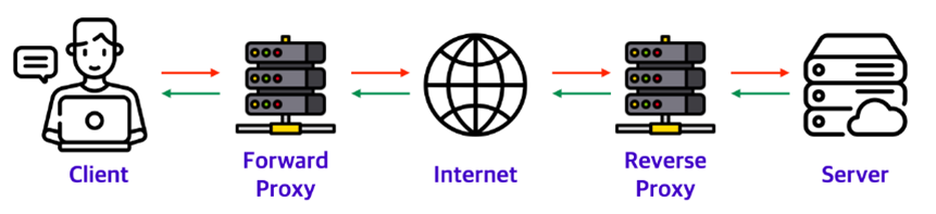 Forward Proxy (포워드 프록시) : 클라이언트 -서버 구조에서 클라이언트 쪽을 대리하며, 클라이언트애서 서버로 리소스를 요청할 때 직접 요청하지 않고 프록시 서버를 거쳐서 요청합니다.