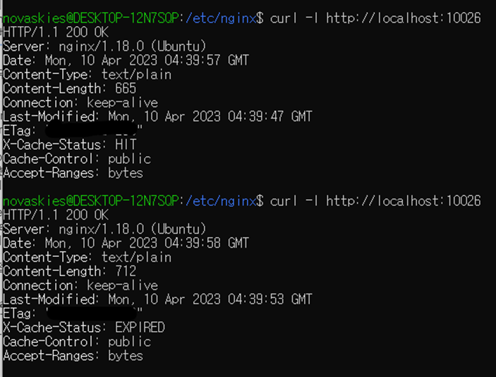 4. Nginx 작동 후 Curl -I http://localhost:10026 으로 캐시 내용 확인 합니다.