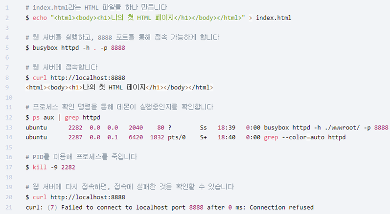 busybox는 각종 유틸리티를 담은 일종의 “스위스 군용 칼”과 같은 리눅스용 애플리케이션으로, 아주 단순한 기능을 가진 웹 서버(httpd)를 포함하고 있습니다.