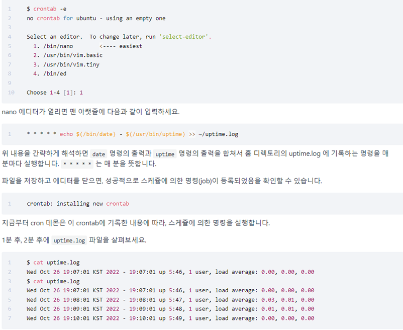 cron 데몬은 스케쥴에 따라 명령을 실행하는 도구입니다. cron은 해당 작업을 백그라운드에서 실행하며(즉, 데몬입니다), 따라서 사람의 개입 없이 자동적으로 주기에 따라 명령을 실행할 수 있습니다.