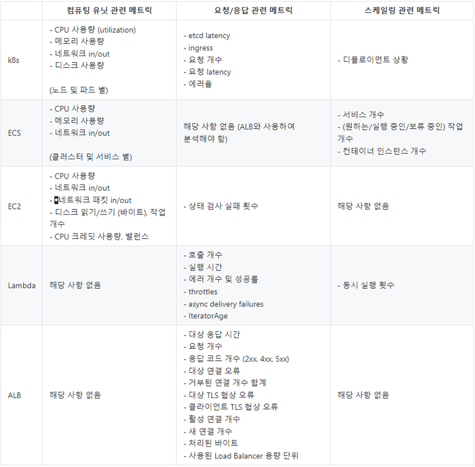 HTTP 요청/응답 관련 모니터링 대상은 쿠버네티스의 경우 인그레스, AWS 생태계에서는 Application Load Balancer를 중점으로 보아야 합니다.