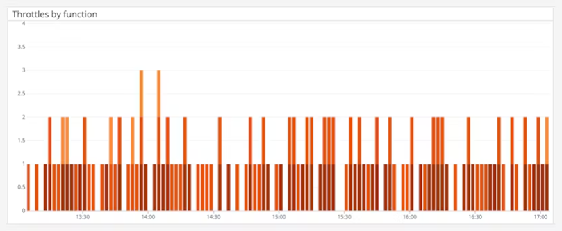 10. 타임아웃(throttles)은 람다가 풀이 고갈되어 모든 들어오는 요청을 거부하는 것입니다. 타임아웃은 함수의 효율성을 모니터링하는 데 사용될 수 있으며, 그래프에서의 증가는 함수가 처리할 수 있는 요청보다 더 많은 요청이 있고 함수에 충분한 용량이 없는 것을 나타낼 수 있습니다. 이를 방지하기 위해 예약된 동시성을 할당하거나 처리할 요청의 수를 제한할 수 있습니다.