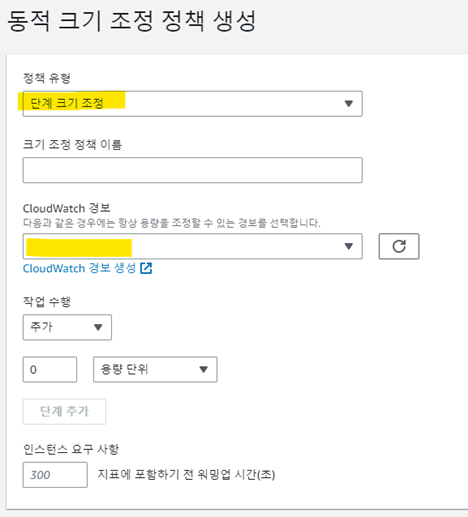 - 단계 크기 조정으로 선택하고 Cloudwatch 에서 생성한 경보하고 연결합니다.