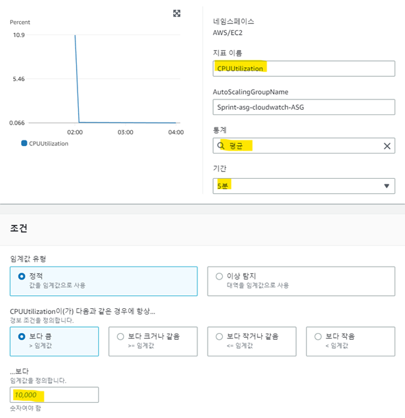 - CloudWatch 경보는 EC2 -> auto Scale Group 선택하고 나서 CPU Utilization 선택 후 원하는 값 기입해서 생성합니다.