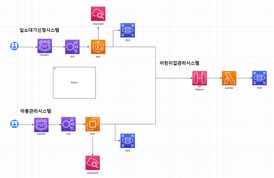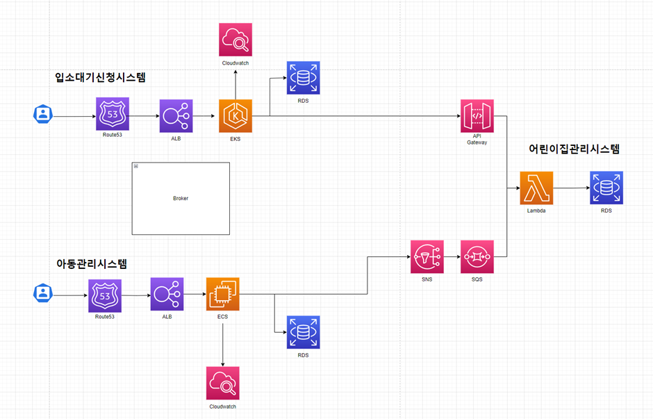 수정된 아키텍처에서는 입소대기 신청 시스템에서 동일하게 API Gateway 으로 Lambda 함수 트리거 하는 방식이지만 아동 관리 시스템에 SNS+SQS 추가하여 데이터베이스 정보들이 유지 할 수 있도록 설계 하였습니다.