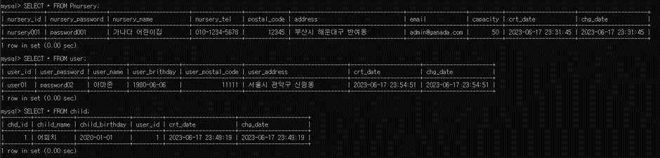 2.8 SELECT * FROM <nursery>; 하면 테이블에 있는 데이터를 볼 수 있습니다.